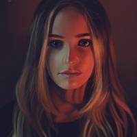 fair skin and is wearing what appears to be a dark-colored top or shirt that contrasts with her light-colored hair. The background is minimalistic with warm tones, possibly indicating