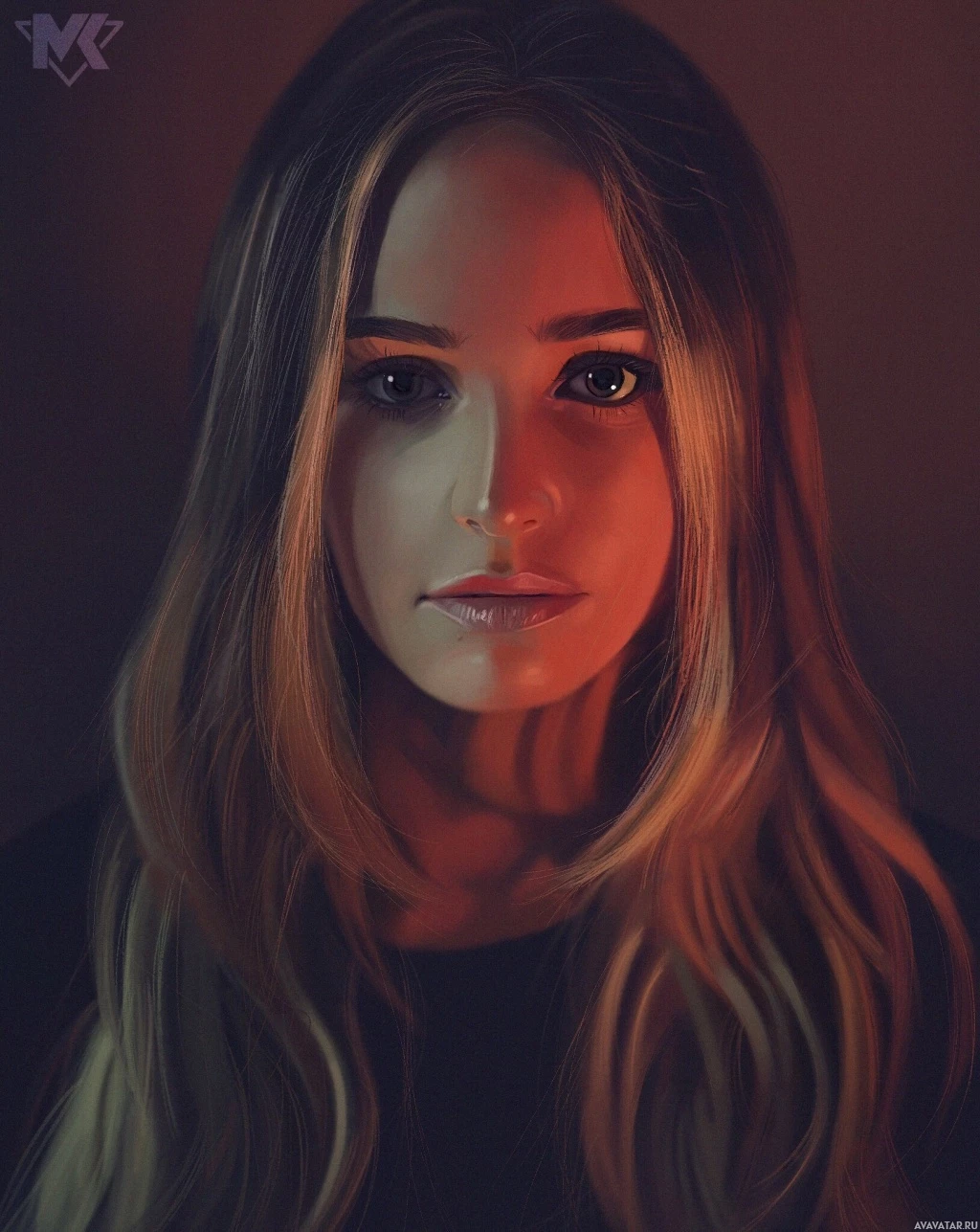 a young woman with long hair, looking directly at the viewer. She has