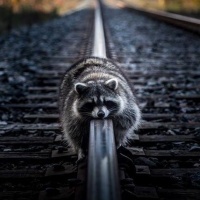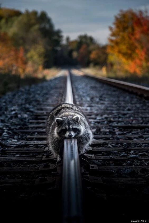 The image shows a raccoon sitting on the rail of