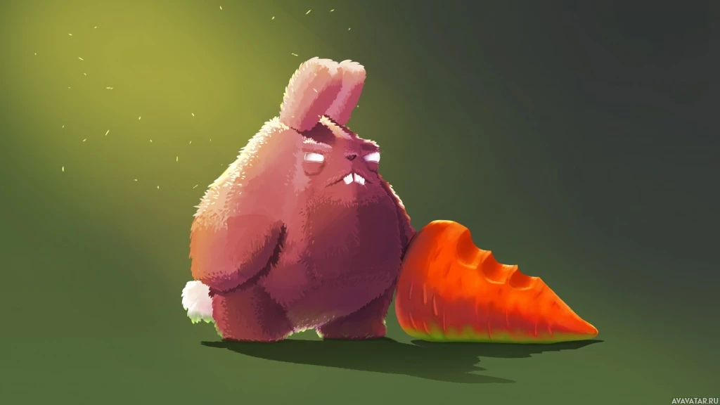 pink fur, white inner ears, and is sitting on one leg with the other leg extended forward. There are two carrots in front of it: one orange and the other green. The background suggests