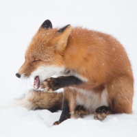 The image shows a red fox in the snow. It appears to be yawning or possibly displaying some kind of facial expression that might be interpreted as being surprised or caught off guard. The fox has its mouth open, which could give the impression of it yelling or communicating with another animal.