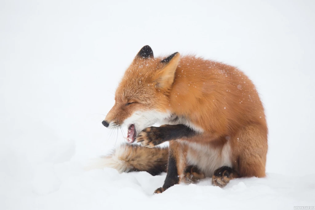 На картинке изображена рыжая лиса на снегу. Кажется, что она зевает или, возможно, демонстрирует какое-то выражение лица, которое может быть истолковано как удивление или застигнутое врасплох. Рот лисы открыт, что может создать впечатление, что она кричит или общается с другим животным.