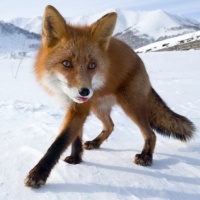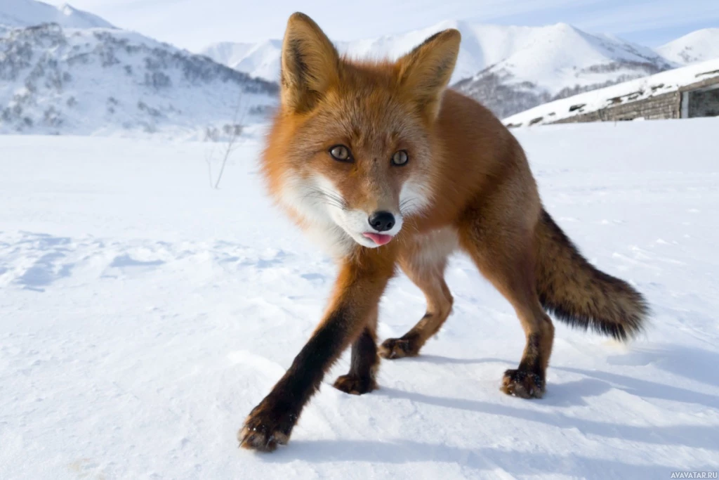 На картинке изображена рыжая лиса, стоящая в снегу. Лиса выглядит настороженной и внимательной, возможно, она реагирует на что-то в своем окружении или позирует для фотографии. Судя по наличию снега и горному пейзажу, на заднем плане может быть зима или ранняя весна.