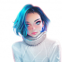 blue hair and are wearing a high-necked, long-sleeved top with some kind of pattern on it, paired with tights or stockings underneath. There is also a watermark in the image that reads "BLKKKK," which likely indicates the artist's signature or mark. The style of the illustration is modern and somewhat stylized, commonly found in