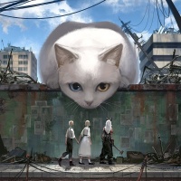 a crumbling wall. In front of this creature are three figures: two individuals who appear to be human and one that is more animalistic in appearance, possibly a wolf. They seem to be looking up at the cat-like being with