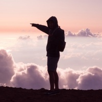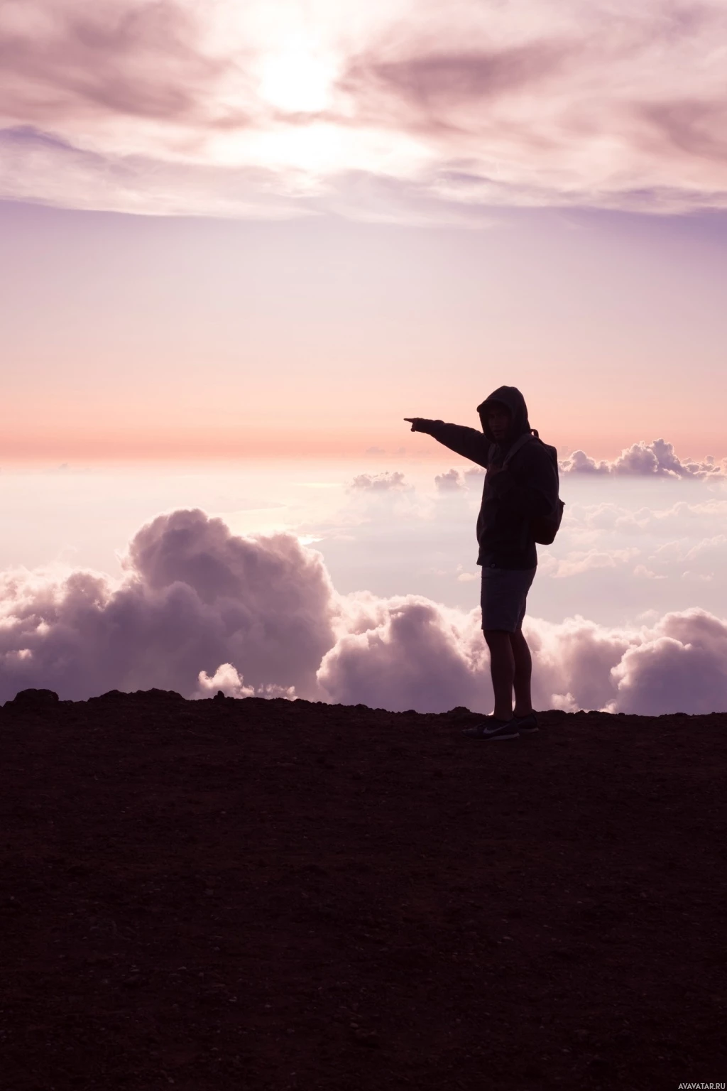 the warm tones in the sky. The person is silhouetted against this background, wearing a backpack which suggests they may be hiking or trekking. Their hand is raised towards the sky, possibly pointing at