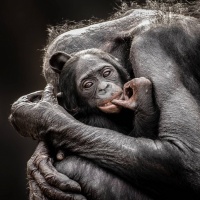 a baby chimp. The adult chimp is displaying an embrace with one arm around the infant, while the other hand is gently placed on the head of the baby. Both individuals have short fur, which is typical for their species, and are in
