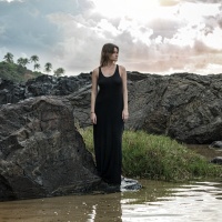 The image shows a person standing in the water near rocks. It appears to be either dawn or dusk, given the soft lighting and cloudy skies. The individual is wearing a long dress that could be considered formal attire. The setting seems peaceful and natural, possibly on a beach or coastal area.