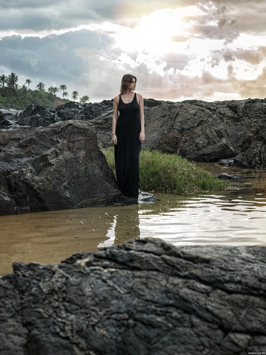 На картинке изображен человек, стоящий в воде возле скал. Судя по мягкому освещению и облачному небу, сейчас либо рассвет, либо сумерки. На человеке длинное платье, которое можно принять за официальный наряд. Обстановка кажется спокойной и естественной, возможно, это пляж или прибрежная зона.