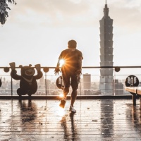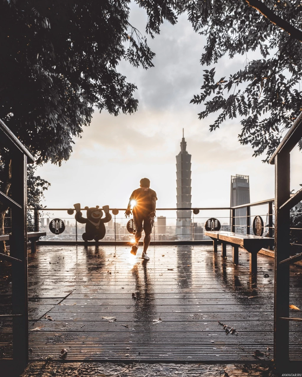 a moment of relaxation or taking in the view of the city during either sunrise or sunset, given the warm lighting and soft shadows on the environment.