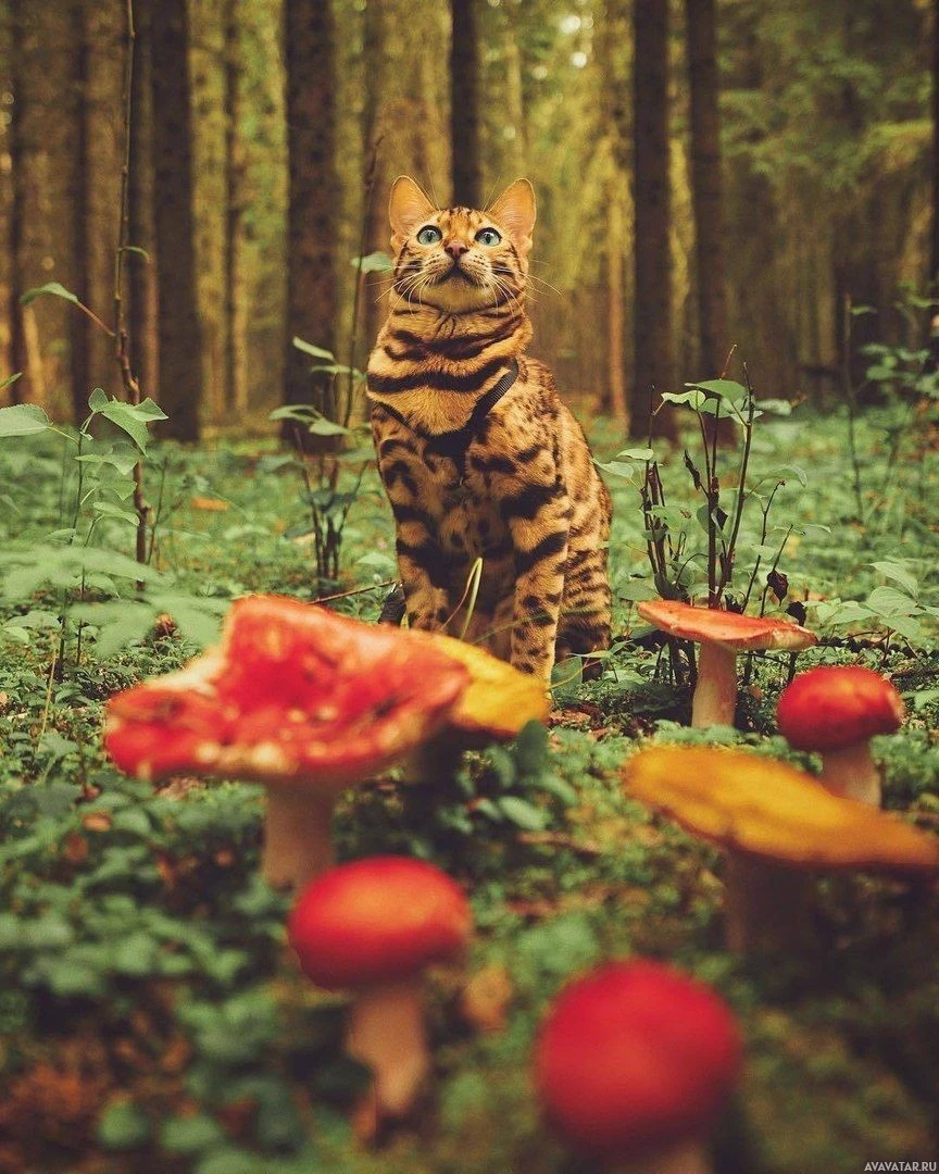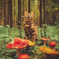 fur pattern and distinctive ears visible. Surrounding the cat are various mushrooms of different sizes and colors, which is typical for