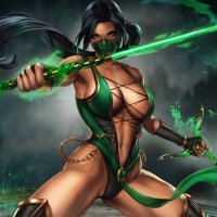 The image depicts a female character from the "Mortal Kombat" video game series. She is wearing a green costume and has a staff with a green glow at the tip, suggesting that she might have magical or elemental powers within the context of the game. Her pose suggests readiness for combat, which aligns with her character being a warrior or a fighter in the Mortal Kombat universe.