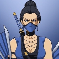 The image shows an animated character from the Mortal Kombat video game series. This character is known as Kitana, who is depicted wearing her iconic attire: a blue bodysuit with golden accents and wielding two sais. Her expression is intense, and she has her hair styled in a bun.