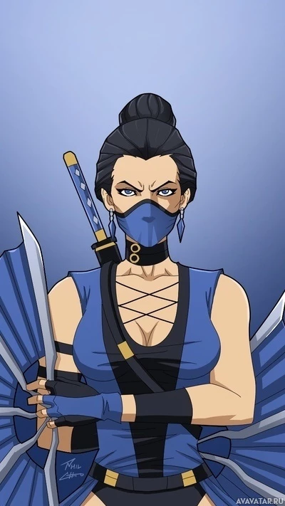 На картинке изображен анимационный персонаж из серии видеоигр Mortal Kombat. Этот персонаж известен как Китана, которая изображена в своем культовом наряде: синем боди с золотыми вставками и двумя саями в руках. Выражение ее лица напряженное, волосы собраны в пучок.