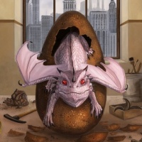 dragon hatchling emerging from an open egg. The dragon has pinkish-purple skin with