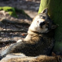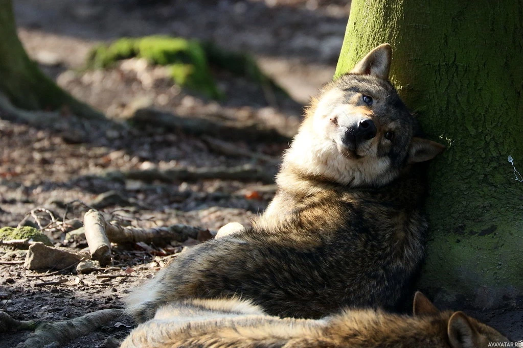 На картинке изображен волк, который лежит, прислонившись головой к стволу дерева. На заднем плане также изображен другой волк, частично скрытый телом первого волка. Оба волка, по-видимому, находятся в естественной среде обитания, вокруг них видна растительность.