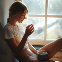 an open window. She appears to be in her underwear and is holding a smartphone in her hand. Next to her on the windowsill, there is a cup. The lighting suggests it might be sunset or dawn. There are also reflections of lights visible through the glass, indicating that there may be streetlights outside the window.