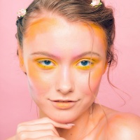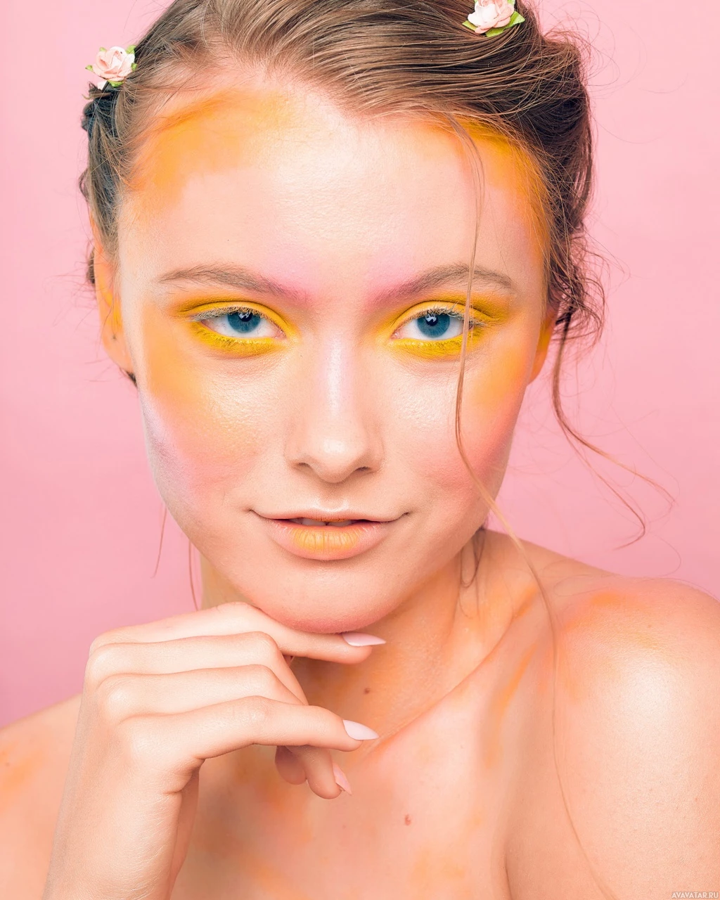 На картинке изображен человек, лицо которого раскрашено в яркие цвета, такие как желтый и розовый, что создает художественный и колоритный внешний вид. Волосы человека собраны на затылке в прическу, напоминающую косички или завитки. Они позируют на простом фоне, вероятно, с целью продемонстрировать нанесение макияжа.