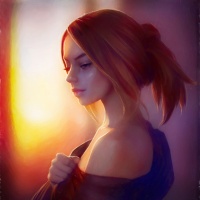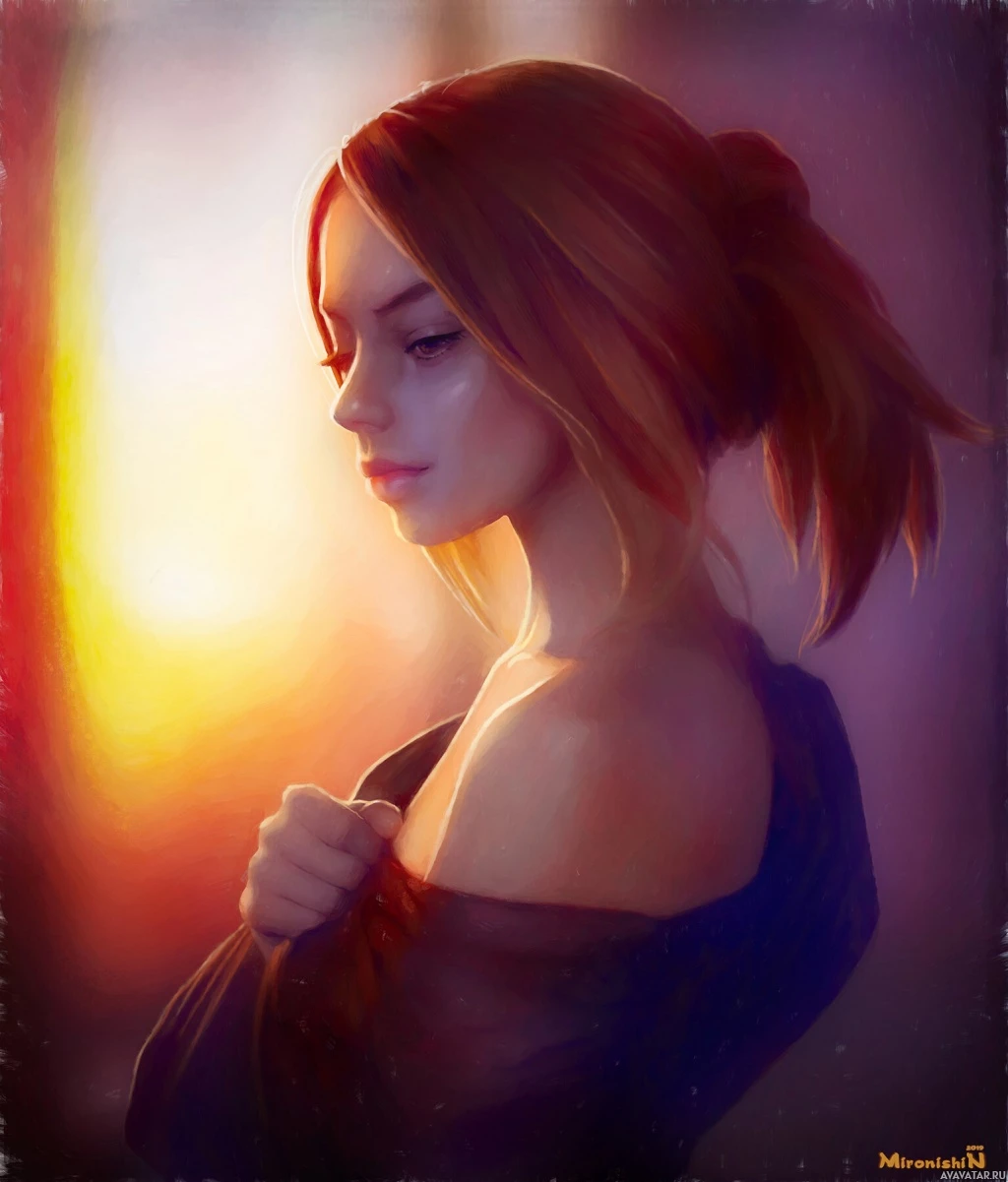 The picture features a digital art illustration of a red-haired girl. She is shown from the side, looking out towards something in front of her with a contemplative or thoughtful expression. Her hair is styled into an updo, and she appears to be wearing