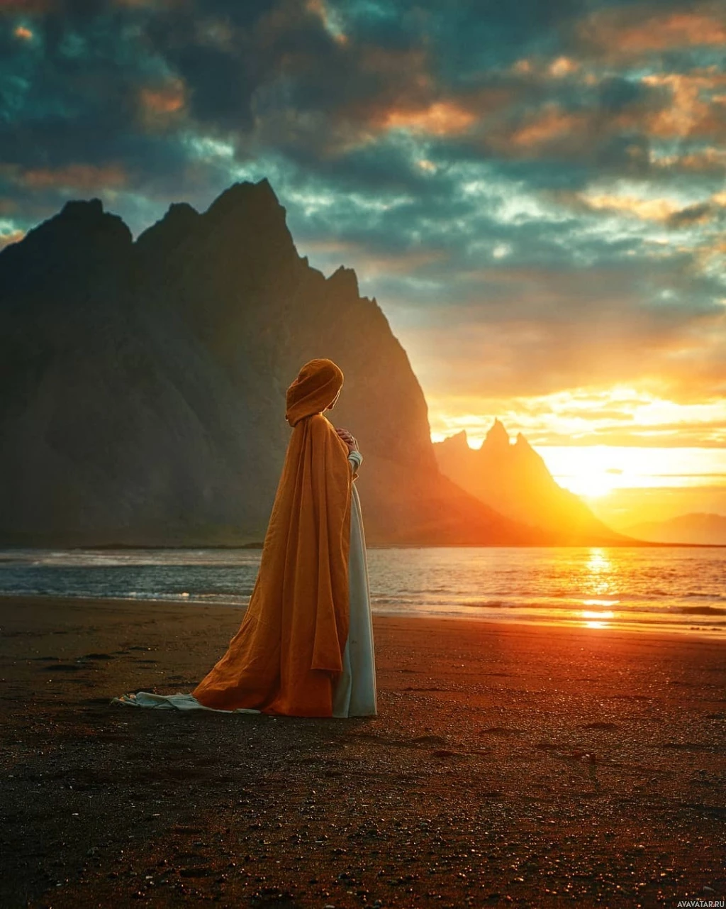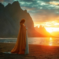 a young woman standing on a rocky shore at sunset. She is wearing a long, flowing yellow garment that could be interpreted as