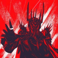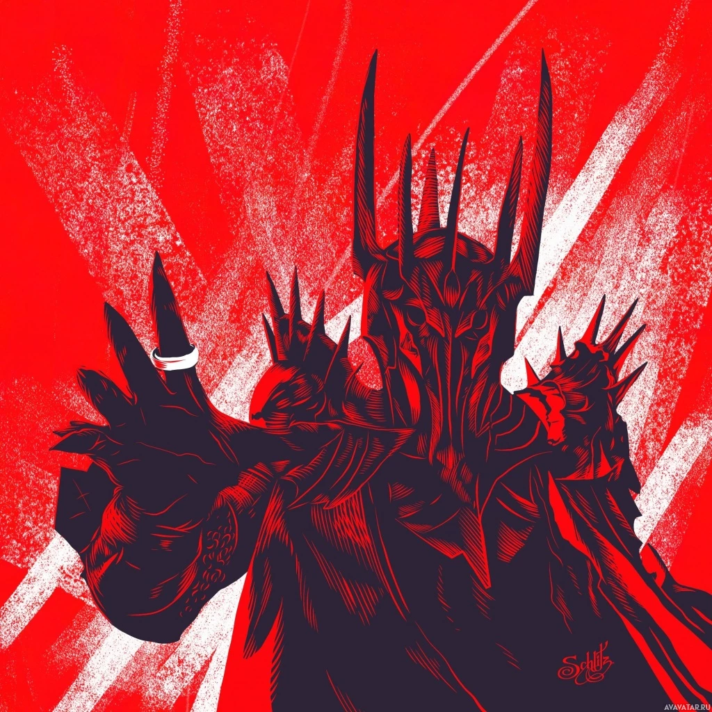 The image shows an illustration of a character that resembles Sauron from J.R.R. Tolkien's Middle-earth mythology. This is evident by the distinctive armor with spikes and