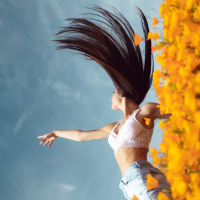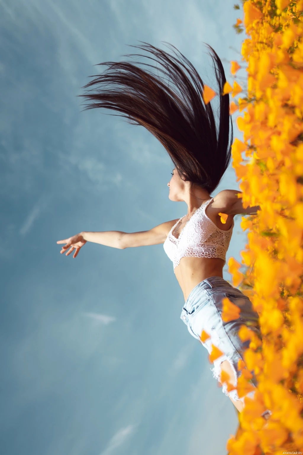 a clear sky, suggesting that it might be spring or summer. There's a blurred effect at the bottom of the photo which gives the impression of her being lifted into the air by the wind, as if she is flying amidst