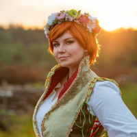 a crown with flowers on her head. Her makeup is done in a style that complements the fantasy theme of her attire. She is standing outdoors during what appears to be sunset or sunrise, with the sky behind her lit by warm colors.
