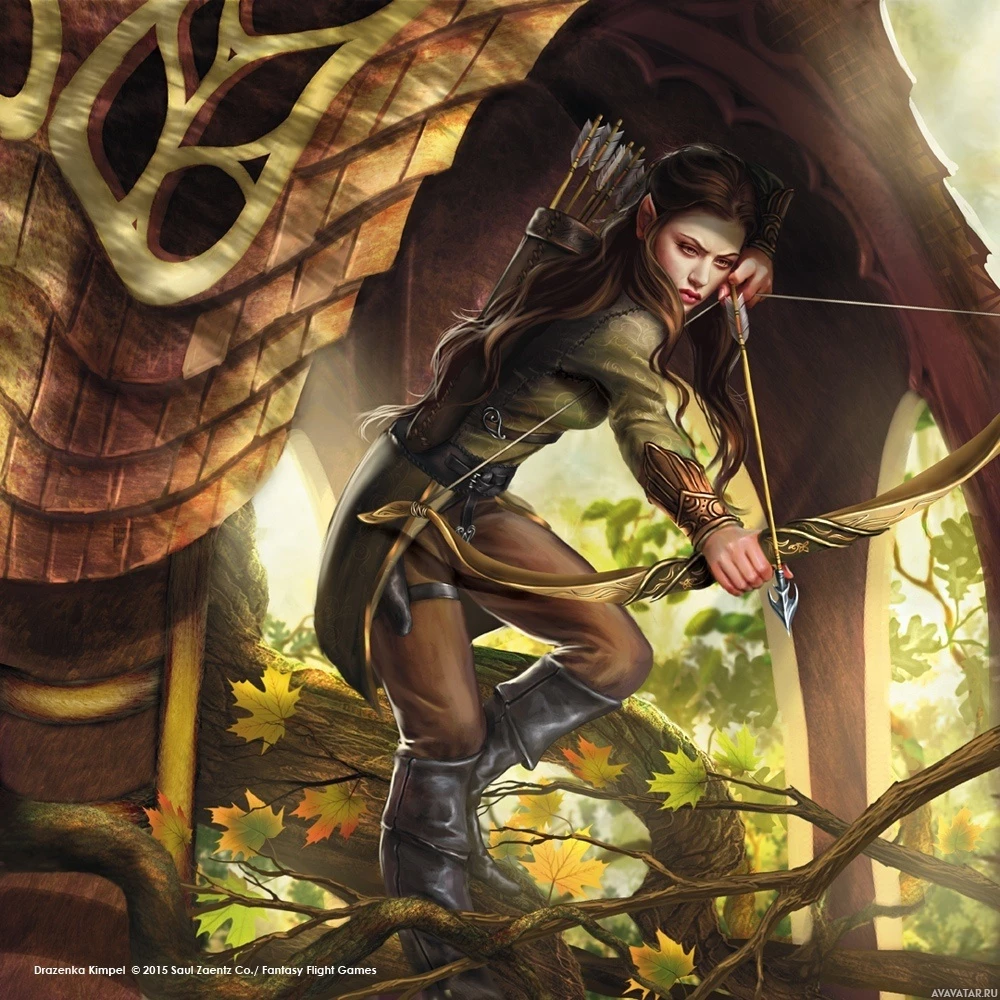 a fantasy setting. She is armed with a bow and appears to be in motion, either shooting the bow or preparing to do so. The background suggests