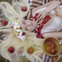 flower garlands and has a wreath or crown of flowers in her hair. Scattered around her are red apples, and she seems to be in