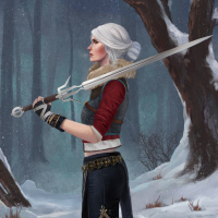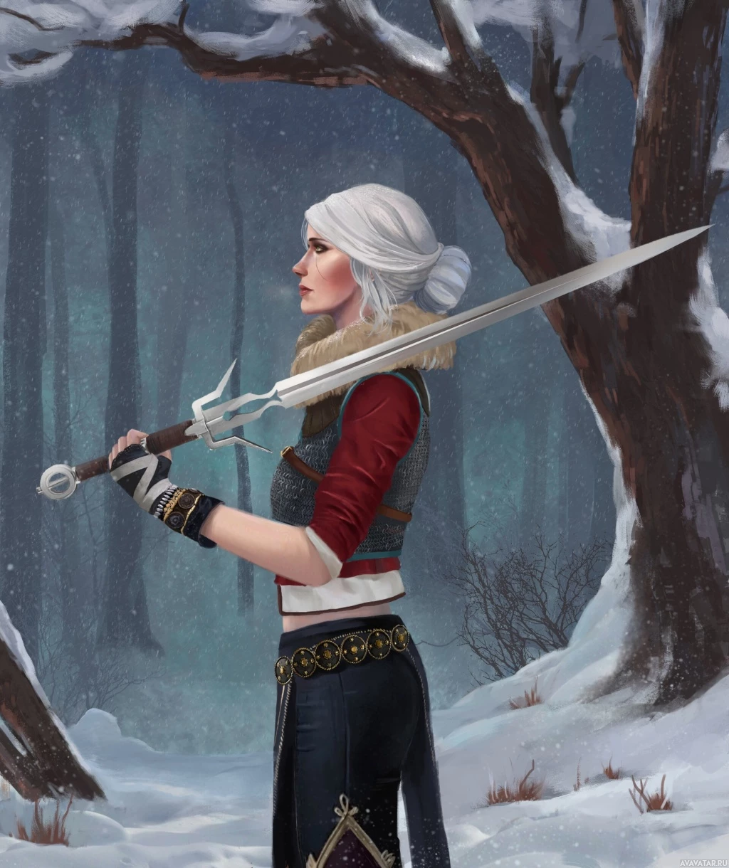 the video game "The Witcher 3: Wild Hunt" known as Ciri. She is depicted in a snowy,