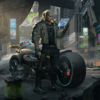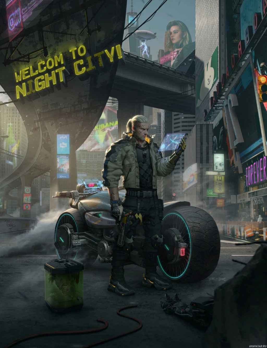the video game "Cyberpunk 2077" named Geralt of Rivia. He is standing on a street in a futuristic