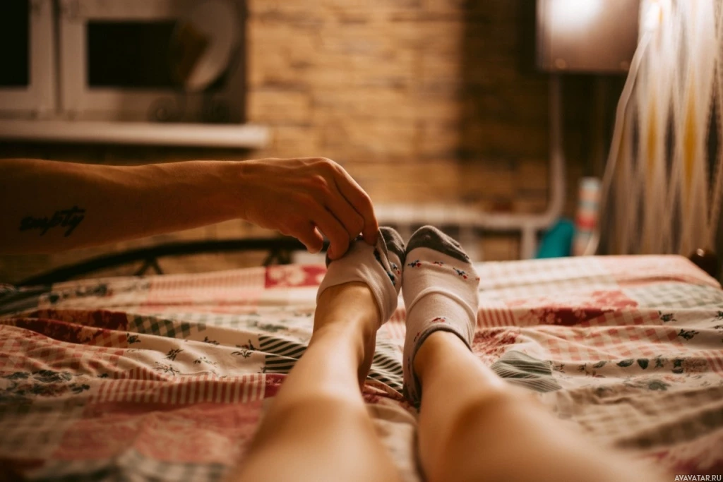 The image shows a person helping another person put on socks. A hand is assisting with the process, likely holding the ankle to position the foot correctly for putting on the sock. It's a scene of assistance, possibly indicative of someone caring for another individual or in