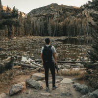 dark clothing and a backpack, suggesting he might be hiking or trekking. The background features a forest with trees and shrubs, indicating that this could be a natural