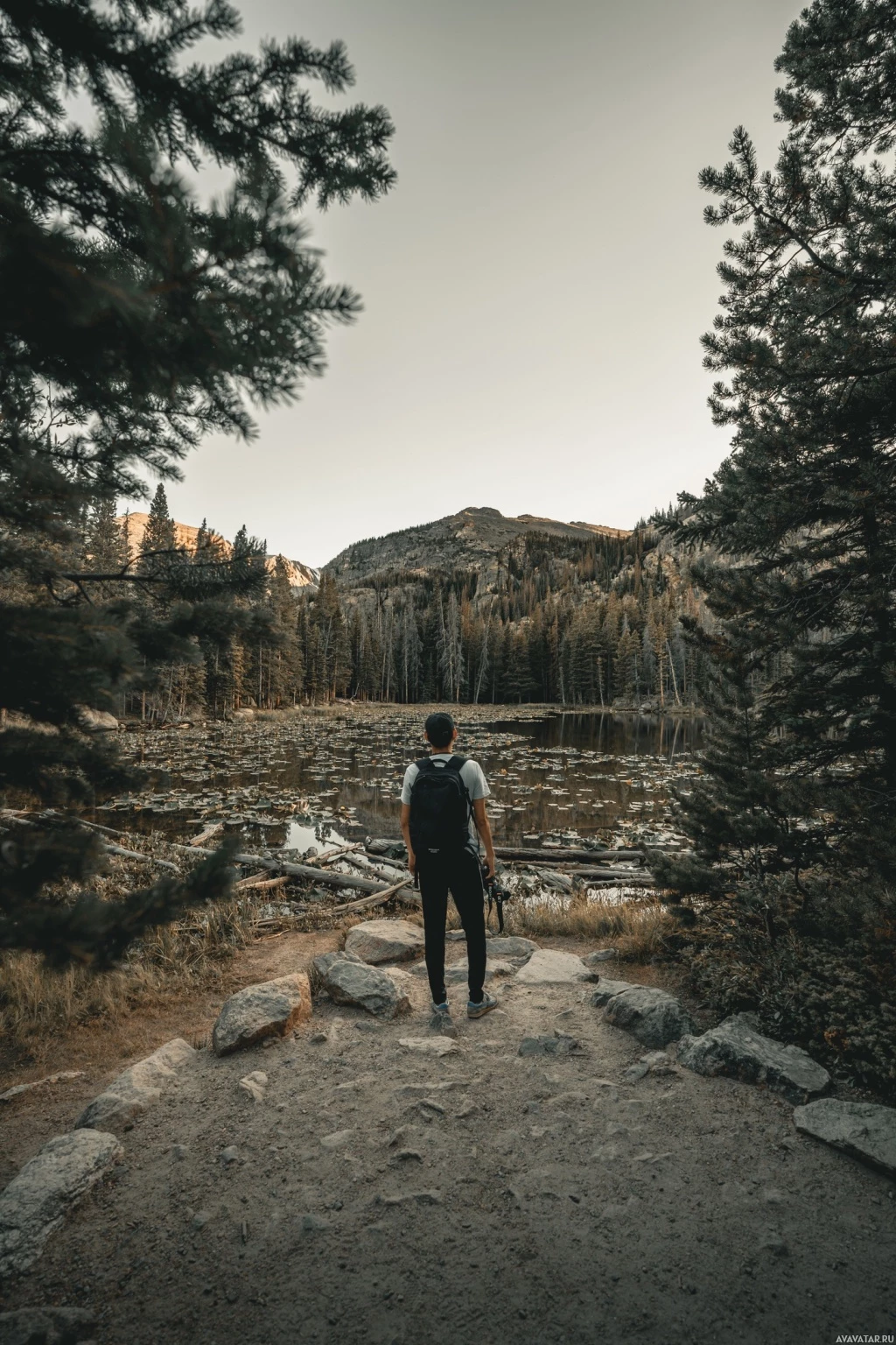 The image shows a person, who appears to be a man based on the silhouette, walking along a trail. He is wearing