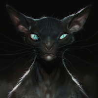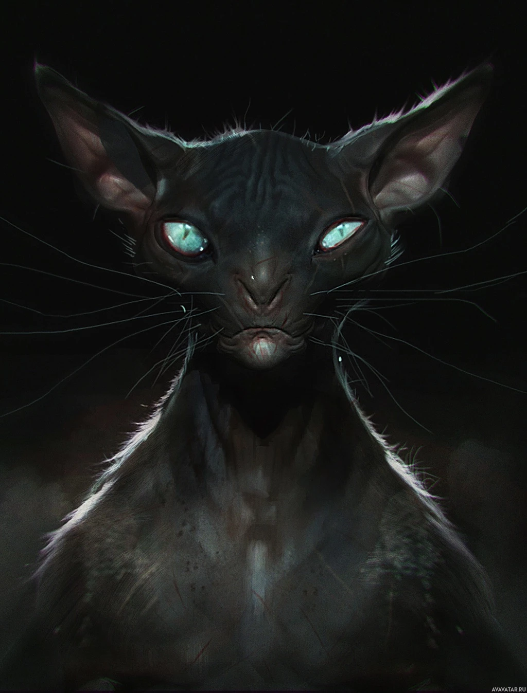 The image shows a stylized depiction of a cat-like creature with human-like features. It has sharp,