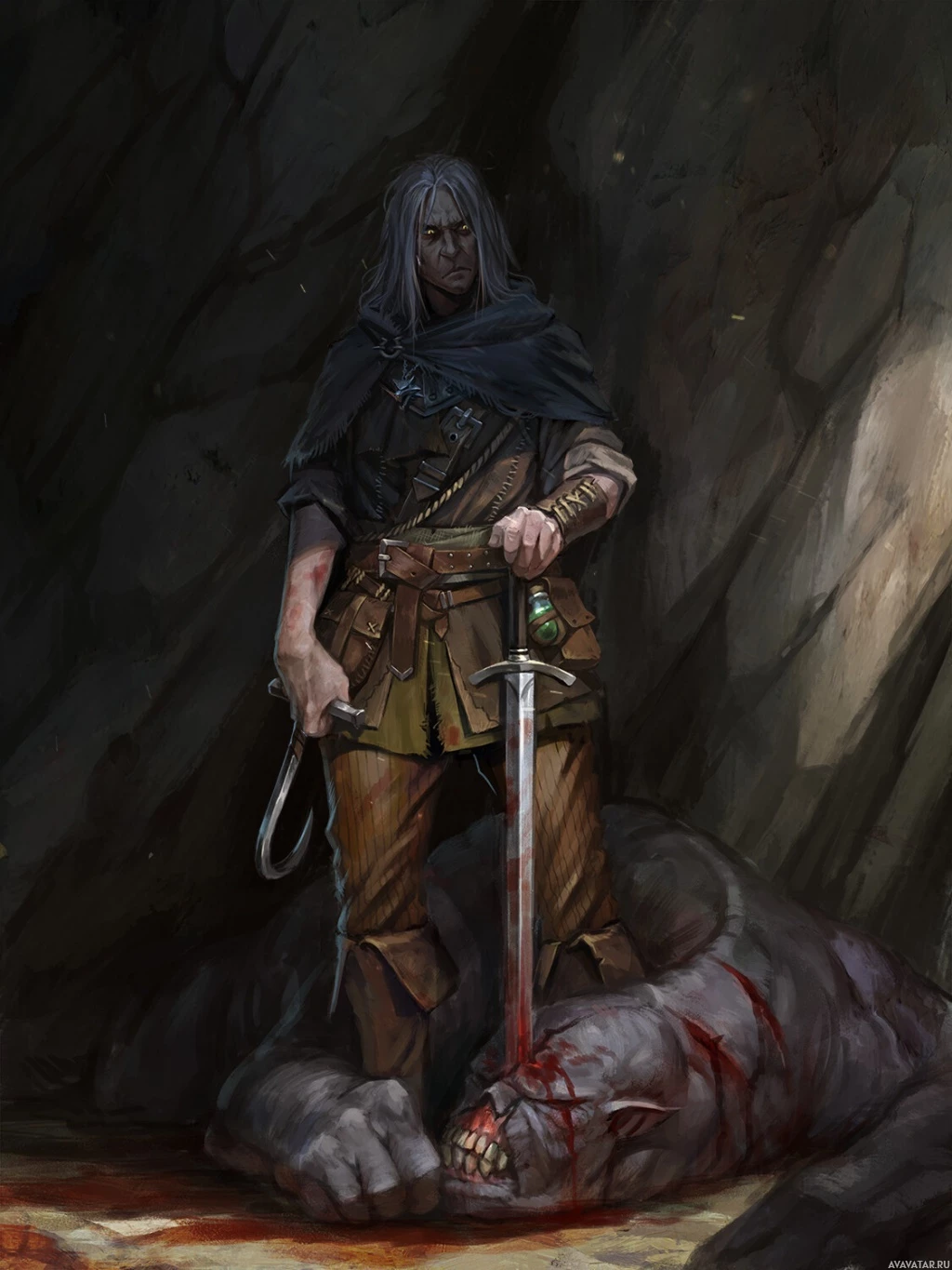 Geralt of Rivia, a monster hunter with silver swords. He is shown in a dynamic pose, standing over a fallen creature that appears to be a werewolf or some other kind of