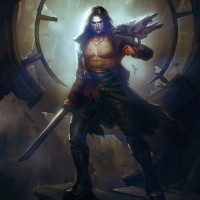 a dramatic pose, wearing armor and holding what appears to be a sword, suggesting they might be a warrior or a fighter of some sort. The background has