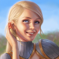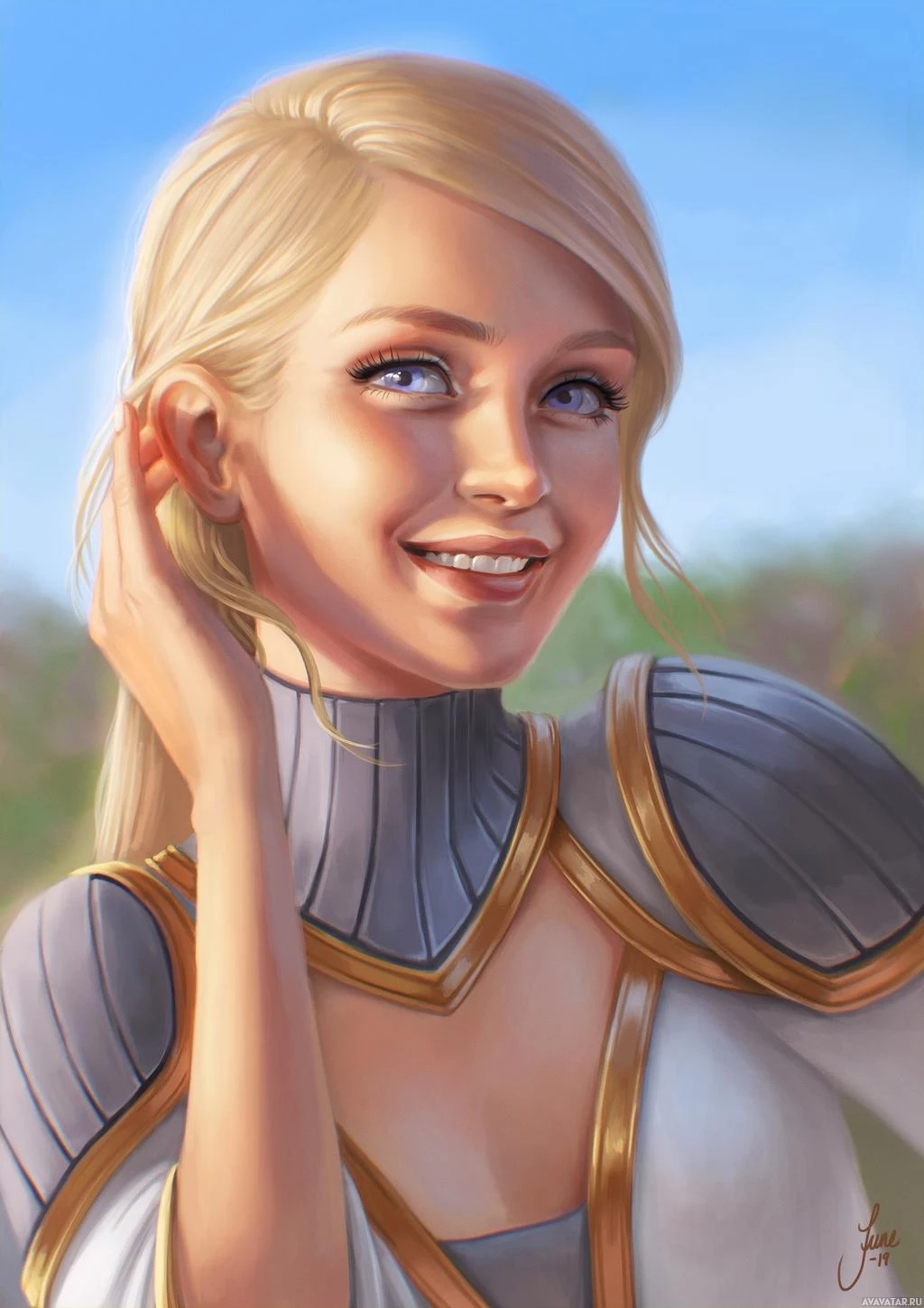 blonde hair and is smiling, looking at the viewer directly with one hand gently placed near her cheek. The character is wearing armor and a cape, which suggests she might be a warrior or adventurer in the context of the artwork's storyline. The style of the image is vibrant and detailed, giving it a dynamic appearance.