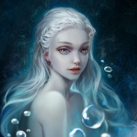 blue tones, giving an underwater ambiance, enhanced by subtle bubbles or circles that suggest movement in the water around her shoulders.