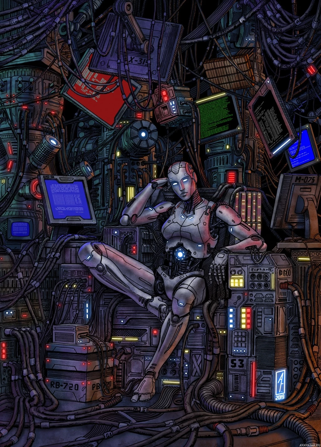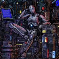 robot character seated among various electronic components and machinery that resembles a high-tech workspace or laboratory. The robot has a humanoid appearance with a metallic body and glowing