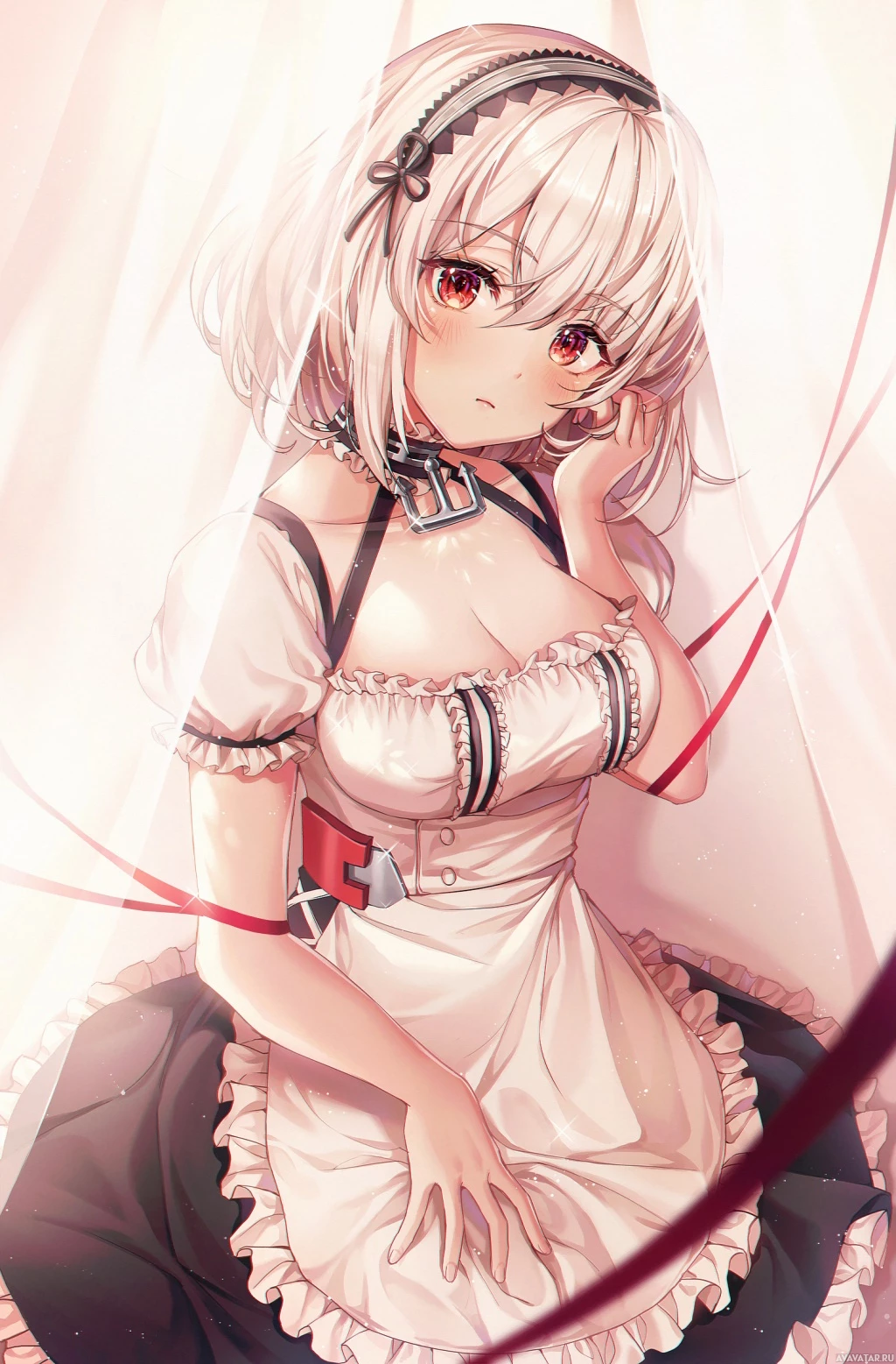 maid attire, complete with a collared dress and a bow on her head. Her expression seems surprised or puzzled as she looks off to the side with one hand raised near her face, suggesting that she might be listening intently to something not visible in the image. The style of animation is consistent with Japanese anime and manga styles.
