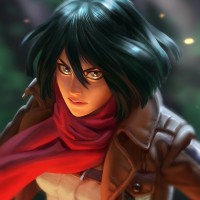 The image features an animated character, a female with dark hair. She is wearing a brown jacket and has a red scarf or bandana tied around her neck. Her expression is serious, and she appears to be looking off to the side rather than directly at the viewer. The background suggests she is in a forest-like environment, possibly from a fantasy setting.