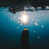 early evening. The sky is darkening, and the reflection of the sparkler on the water creates a peaceful,