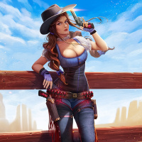 animated character of a red-haired girl dressed in what appears to be a cowgirl costume. She is wearing a hat, sunglasses, and a bandana around her neck. The character is holding a pistol, which is holstered on her hip, and has