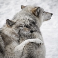 a close embrace. One of the wolves appears to be hugging or embracing the other, and they both seem to be snuggling together. This behavior could suggest
