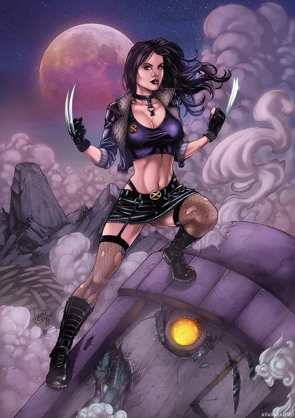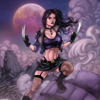 a full moon above, which contributes to the nocturnal atmosphere of the scene. The character is holding two knives, one in each hand, suggesting she may be prepared for combat or self-defense.