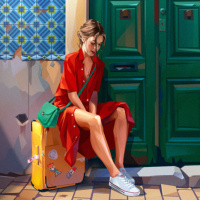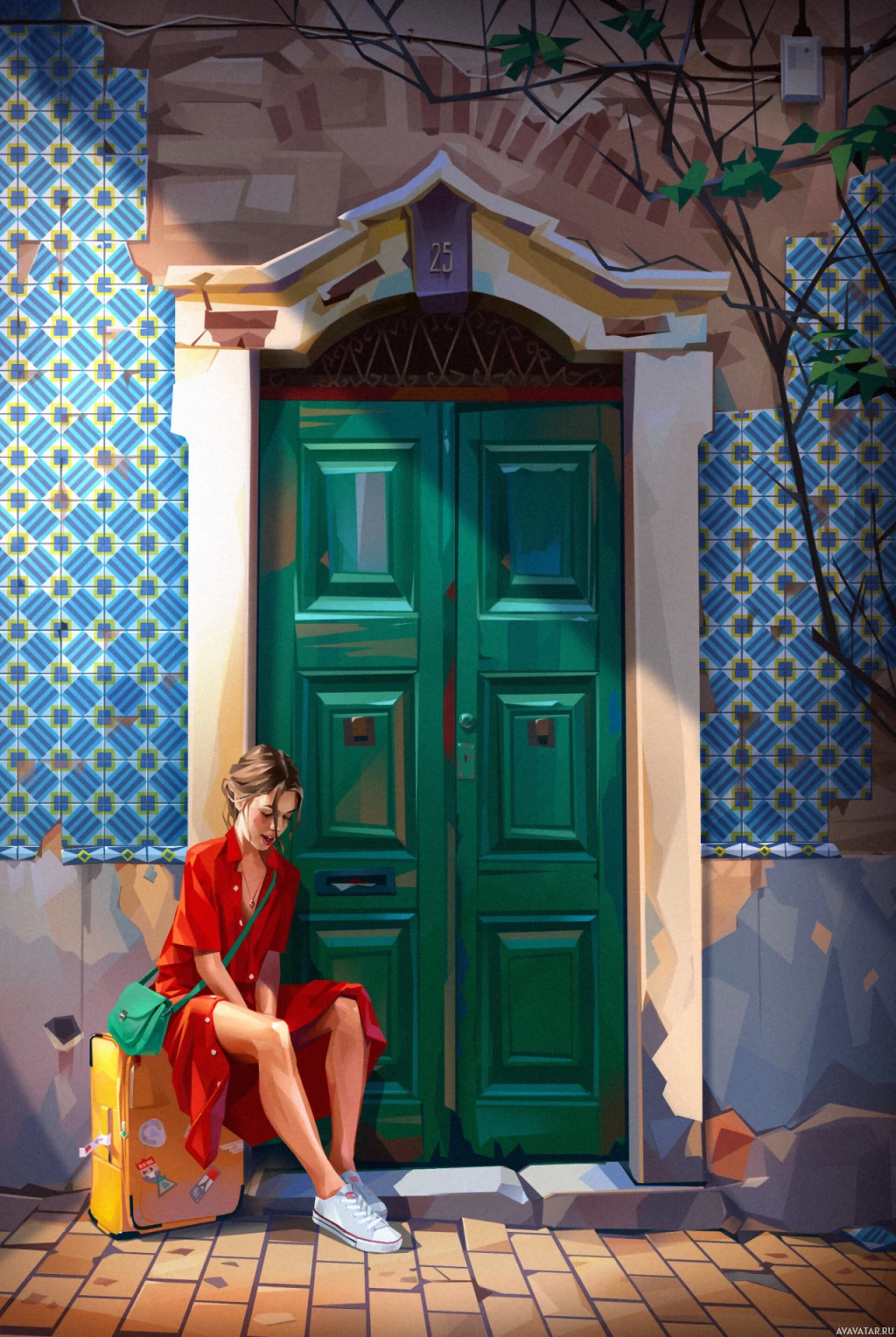 The image depicts a woman sitting on the step in front of a door. She is wearing