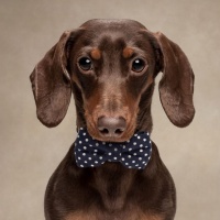 The image shows a dachshund wearing a black bow tie with white polka dots. It appears to be a professional pet portrait, as indicated by the neutral background which is typical for such photoshoots.