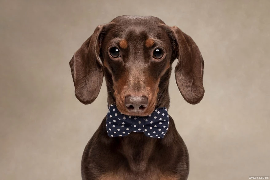 На картинке изображена такса в черном галстуке-бабочке в белый горошек. Судя по нейтральному фону, характерному для подобных фотосессий, это профессиональный портрет питомца.