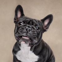 The image shows a small dog, specifically a French Bulldog. It has the breed's characteristic bat-like ears and short legs. The dog is looking directly at the camera with a neutral expression on its face.